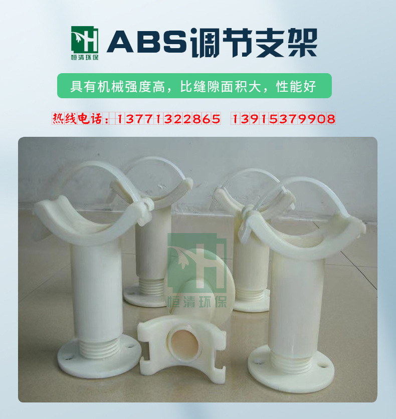 ABS可調管支架由ABS固定底座、ABS螺紋升降管、尼龍扎帶三部分組成。下部通過膨脹螺栓將可調管支架固定于曝氣池底,上部通過尼龍扎帶固定曝氣管,高度可以通過ABS螺紋升降管自由調節。