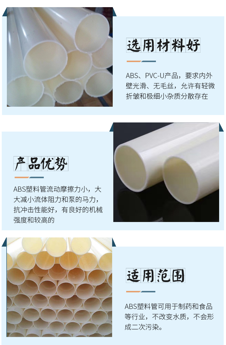 質量,ABS、PVC-U產品,要求內外壁光滑、無毛絲,允許有輕微折皺和極細小雜質分散存在。