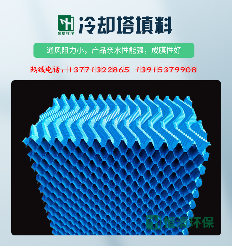 該填料設計合理,數據可靠,經久耐用,通過試驗和生產運行表明冷卻效果好,通風阻力小,產品親水性能強,成膜性好,易于填料的熱傳導。傾斜交一般為60°,主要用于圓形冷卻塔。
