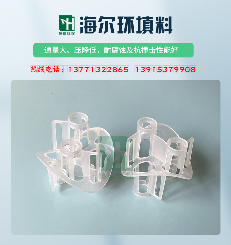 為了提高抗壓強度和增加海爾環的耐老化,我公司通過在聚丙烯的基礎上增加一定量的玻璃增強纖維聚丙烯,通過改性后的塑料海爾環填料不僅具有耐高溫(與聚丙烯材質相比超過20-30℃),還具有耐老化、機械強度高等優點;采用CPVC海爾環填料具有阻燃、耐氯氣、次氯酸鈉腐蝕;采用PVDF材質海爾環還可耐150度以上的高溫。