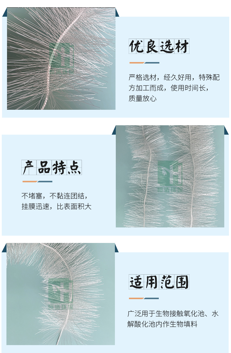 生物膜載體填料是接觸氧化法工藝的核心部分,它直接影響著處理效果、充氧性能、基建投資、運(yùn)行周期和費(fèi)用。由于該填料獨(dú)特的結(jié)構(gòu)形式和優(yōu)良的材質(zhì)工藝選擇,使其具有使用壽命長、充氧性能好、耗電小、啟動(dòng)掛膜快、脫膜更新容易、耐高負(fù)荷沖擊,處理效果顯著、運(yùn)行管理簡便、不堵塞、不結(jié)團(tuán)和價(jià)格低廉等優(yōu)點(diǎn)。該填料在不同的工藝水質(zhì)條件應(yīng)用時(shí),可調(diào)節(jié)絲條粗細(xì)密度及不同的組裝形式,適用不同廢水的厭氧、兼氧、好氧等處理工藝。