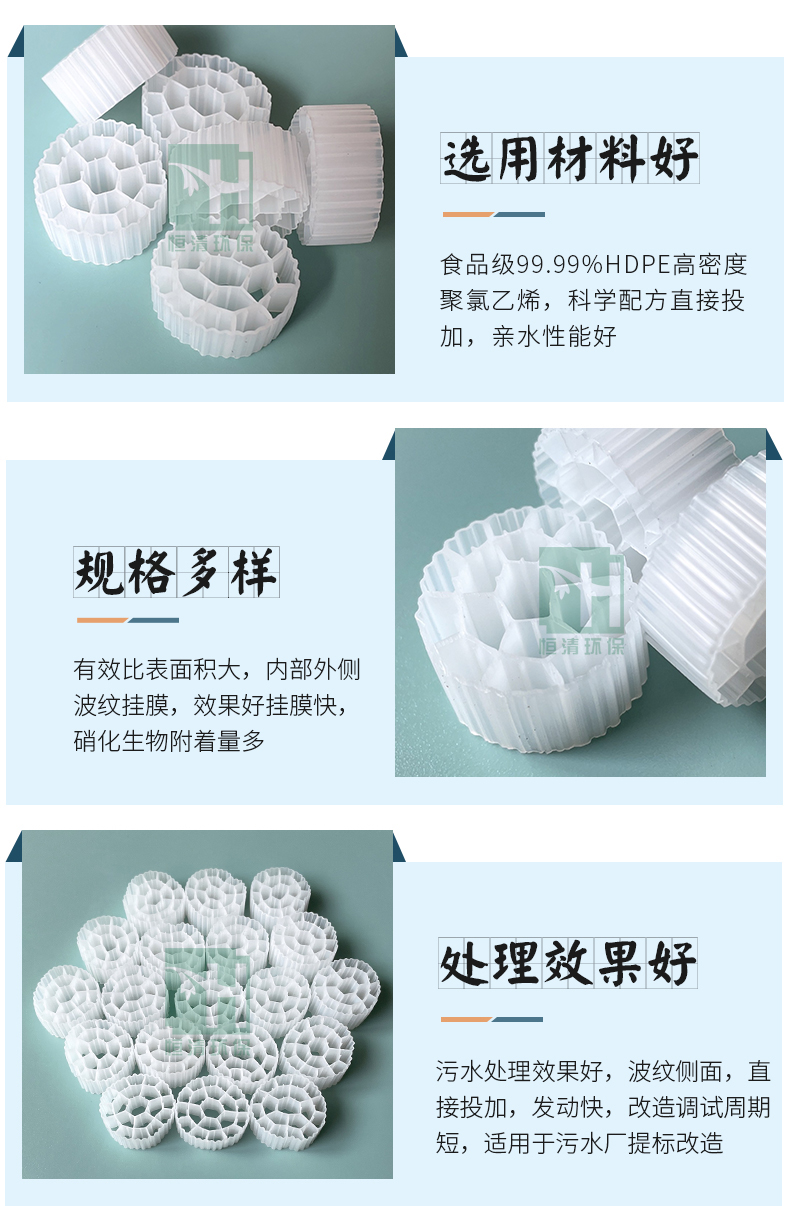 填料系列主要在自來水廠原水膜法頇處理,廢水厭氧、好氧膜法處理,生物膜流化床,粉塵截留、氣體吸收,氣體脫硫塔及高速過濾中得到應用。與現有進口類似(MBBR)填料相比,具有其特殊的優點。