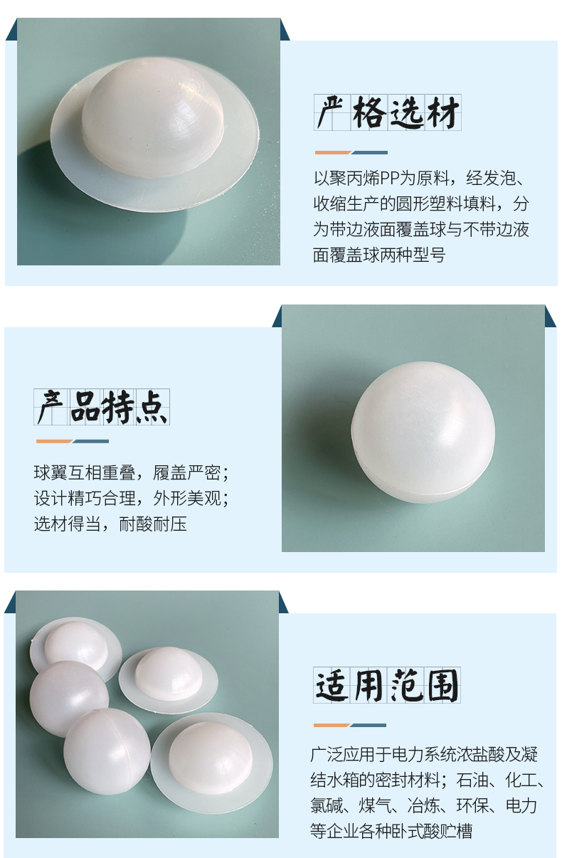 塑料液面覆蓋球以聚丙烯pp為原料,經發泡、收縮生產的圓形塑料填料,分為帶邊液面覆蓋球與不帶邊液面覆蓋球兩種型號,帶邊液面覆蓋球具有重心穩定,邊與邊重疊,覆蓋效果好等特點,其作用是酸霧揮發,保護操作人員健康,減少大氣污染和空氣對水質的污染,有效提高凝結水質量,有利于發電機組、供熱機組的運行。液面履蓋球經過大量科學實驗,它有效地解決了液面履蓋技術難題,可保護水質、凈化環境、防火、節約能源。