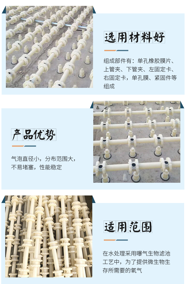 不受池內溫度與氣溫之差,不受濾池高度及濾料空隙率控制,氣泡直徑小,而且氣泡分布范圍大,因曝氣器出口有凹凸等分不易被堵塞,不怕濾料堆壓。