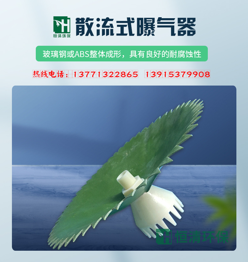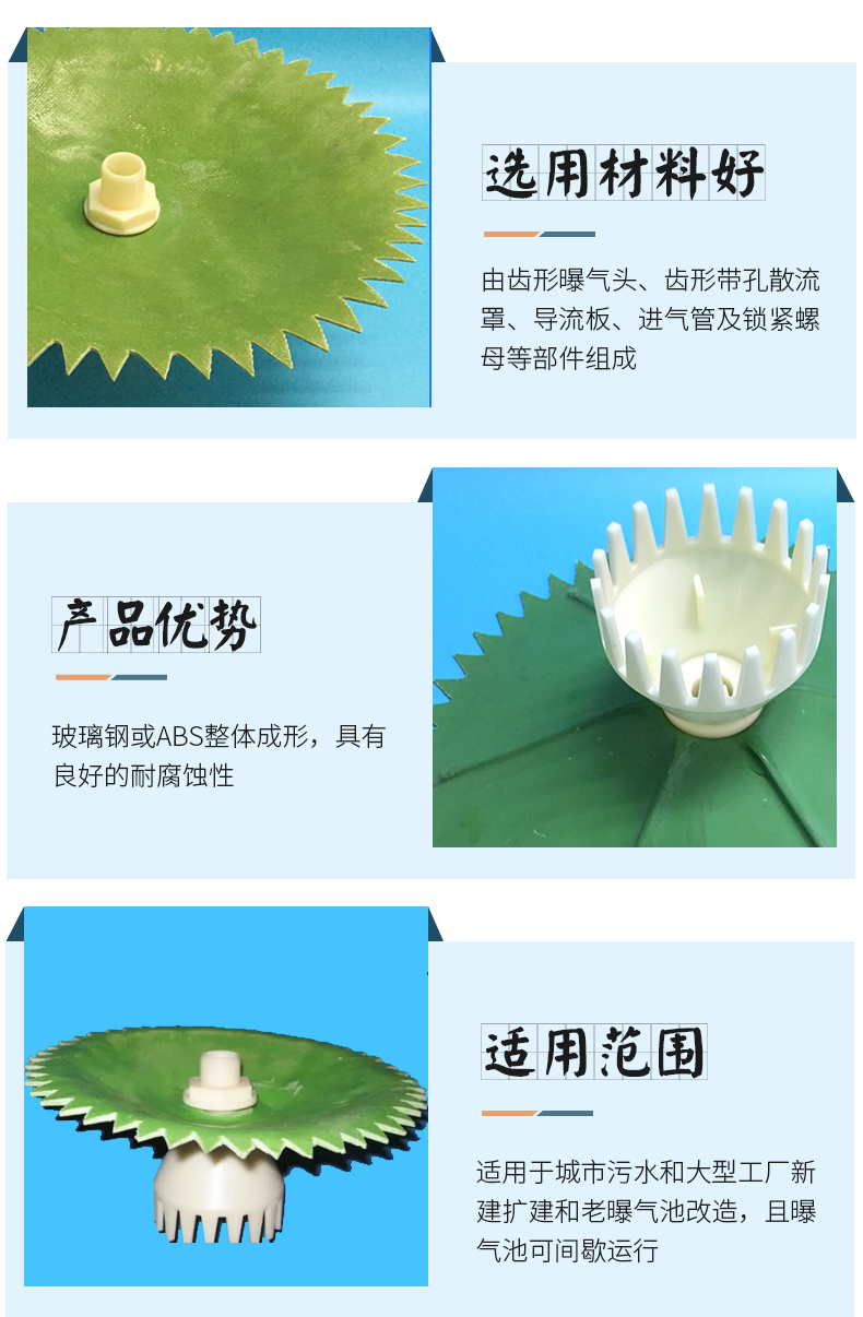 玻璃鋼或ABS整體成形,具有良好的耐腐蝕性。帶有鋸齒的散流罩為倒傘型,傘型中圓處有曝氣孔,起到補(bǔ)氣再度均勻整個(gè)散流罩的作用,可減少能耗,并將水氣混合均勻分流,減少曝氣器對(duì)安裝水平度的要求。散流罩周邊布有向下微傾的鋸齒以求進(jìn)一步切割氣泡。空氣由上部進(jìn)入,經(jīng)反復(fù)切割,提高氧利用率。