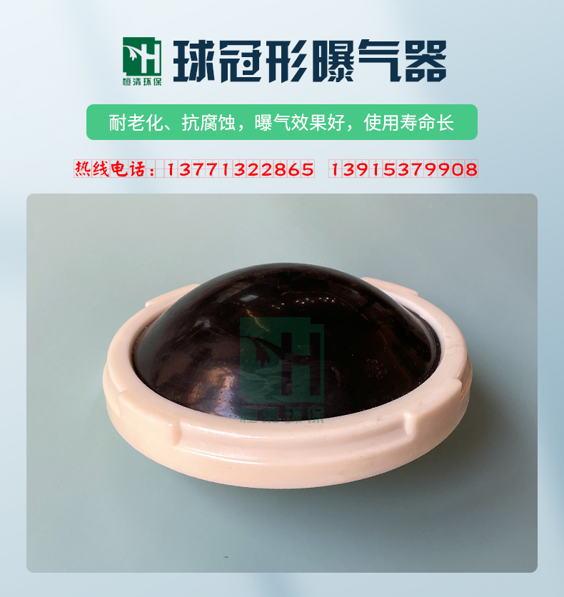 微孔曝氣器及支承托盤呈球冠形結構。該曝氣器具有優異的防堵及防水體倒流的性能。在間歇運行工況條件下,曝氣膜表面不易沉積污 泥,較平板膜片式微孔器使用壽命更長,充氧效率更高,也適用于源水微污染生物處理。